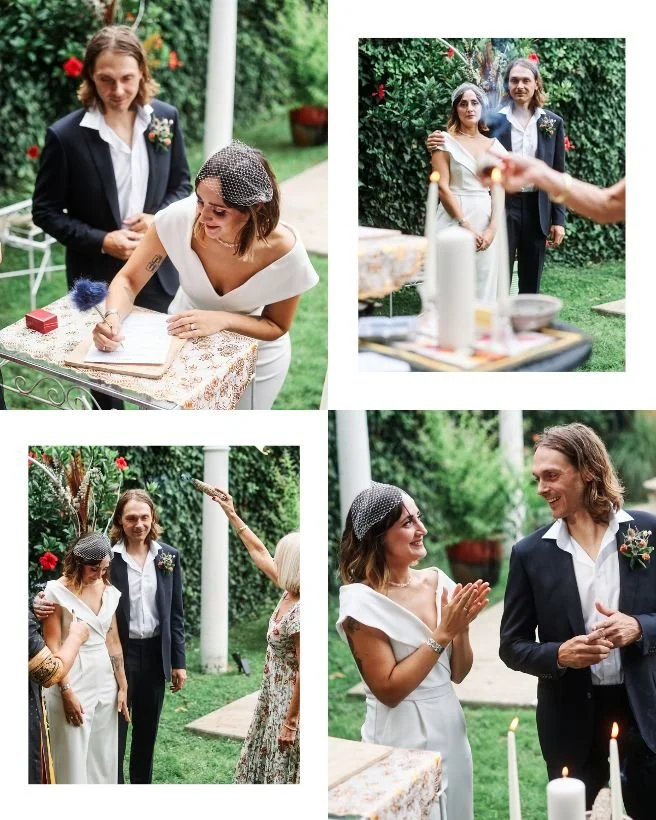 Nat and Lance threw one of the most effortlessly cool backyard weddings I’ve ever seen. It all went down in two connected yards in Germantown, PA—one for the ceremony and cocktail hour (complete with a pool!), and the other for dinner, dancing, and some seriously fun games. These two are incredibly artistic, and you could feel their style and personality in every detail—from the vintage vinyls and funky decor to the colorful florals and Nat’s amazing jumpsuit. The whole day felt super homey and relaxed, like the best kind of garden party with your favorite people. Add in a laid-back pup, good food, great music, and lots of laughter, and you’ve got a wedding that felt like pure magic.