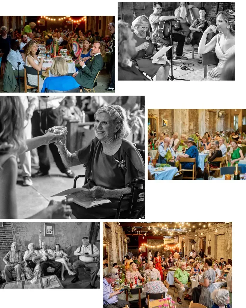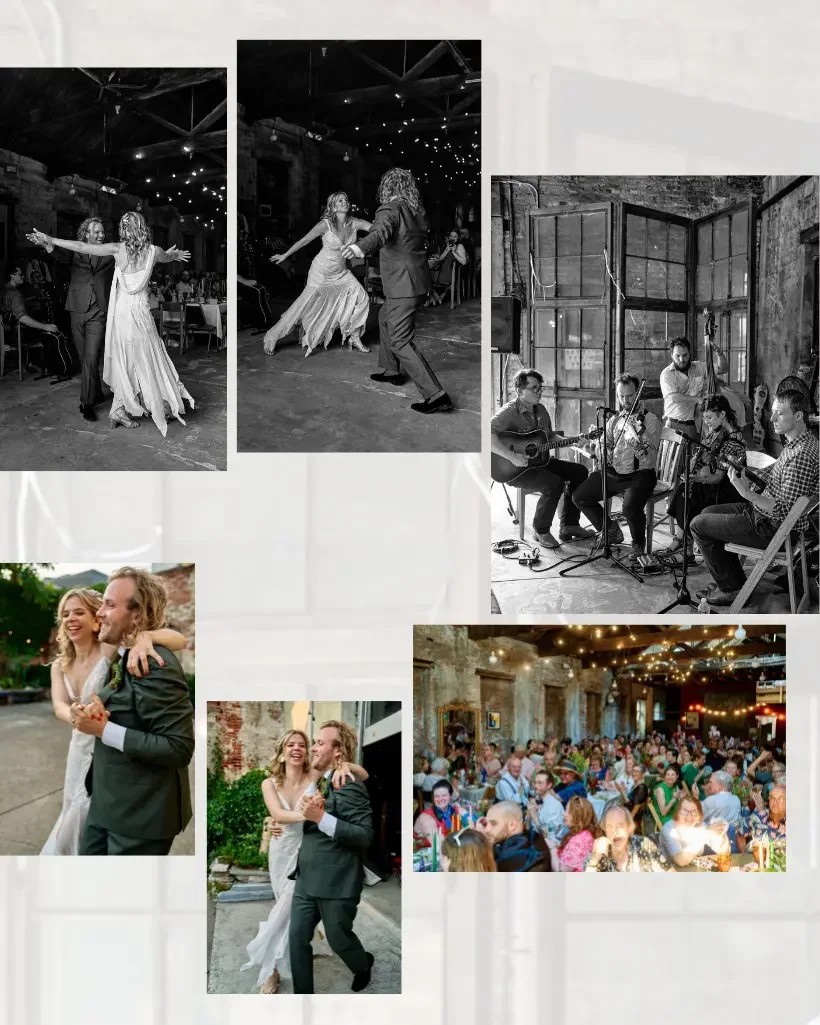 Guests found their seats in the courtyard and the ceremony unfolded against the weathered arch witnessing sweet, personal, and full of laugh-through-tears moments. Cocktail hour rolled right in; the band kicked up, Swig kept everyone happily fed and hydrated, and Carly with her team ran the day like a pro.