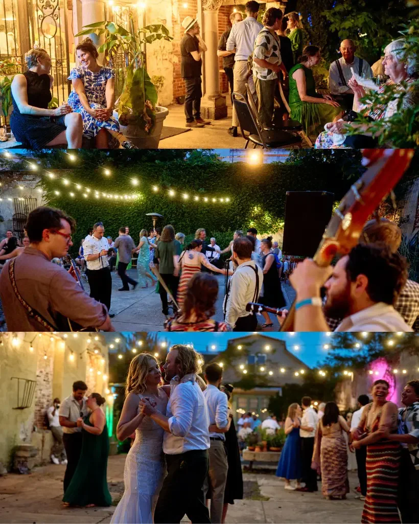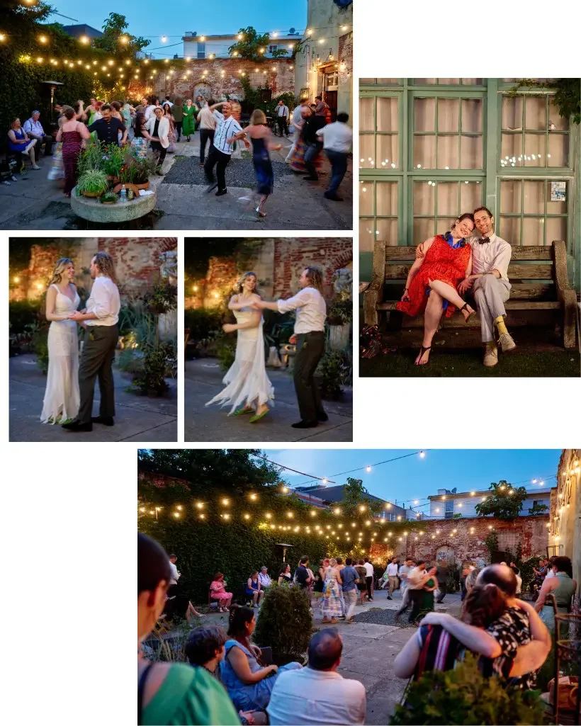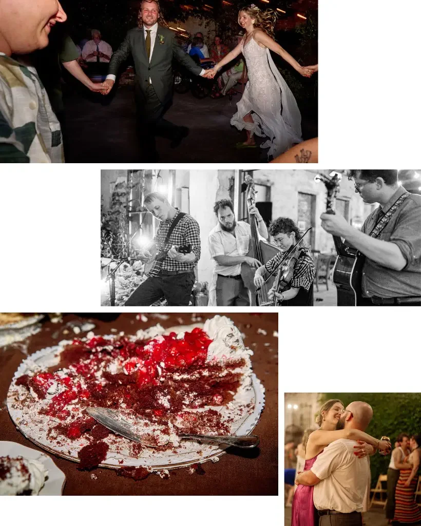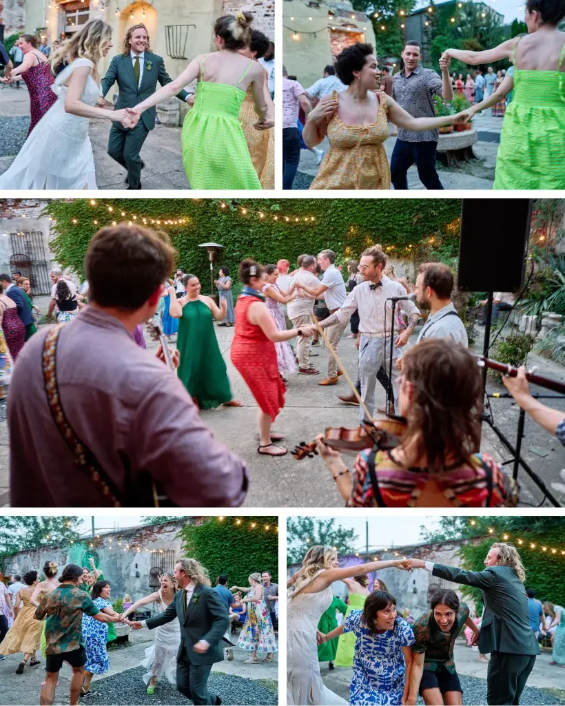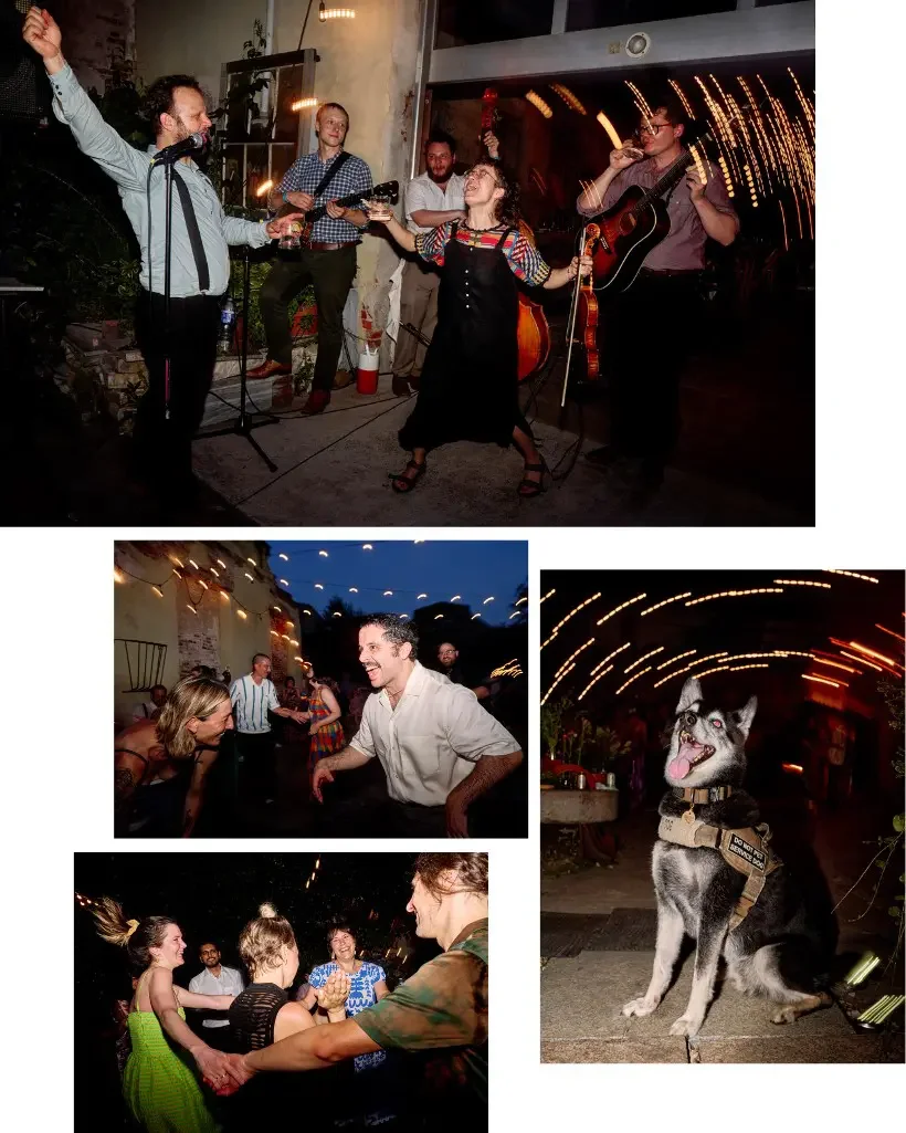 Inside, the reception tables glowed with amber goblets and tall taper candles around wildflower buds, perfect with everyone’s vibrant outfits. Dancing spilled back outside with a fast, folk style, led by West Philly Squares band and loosened into free form, late night moves under the string lights. Somewhere in the mix, a very good service dog made a crowd pleasing cameo. Looking back brings a lot of joy experiencing this heartwarming day.