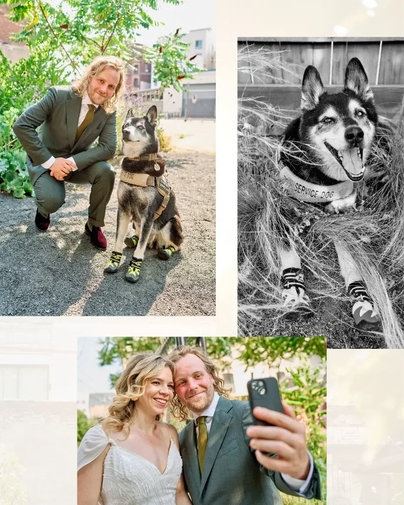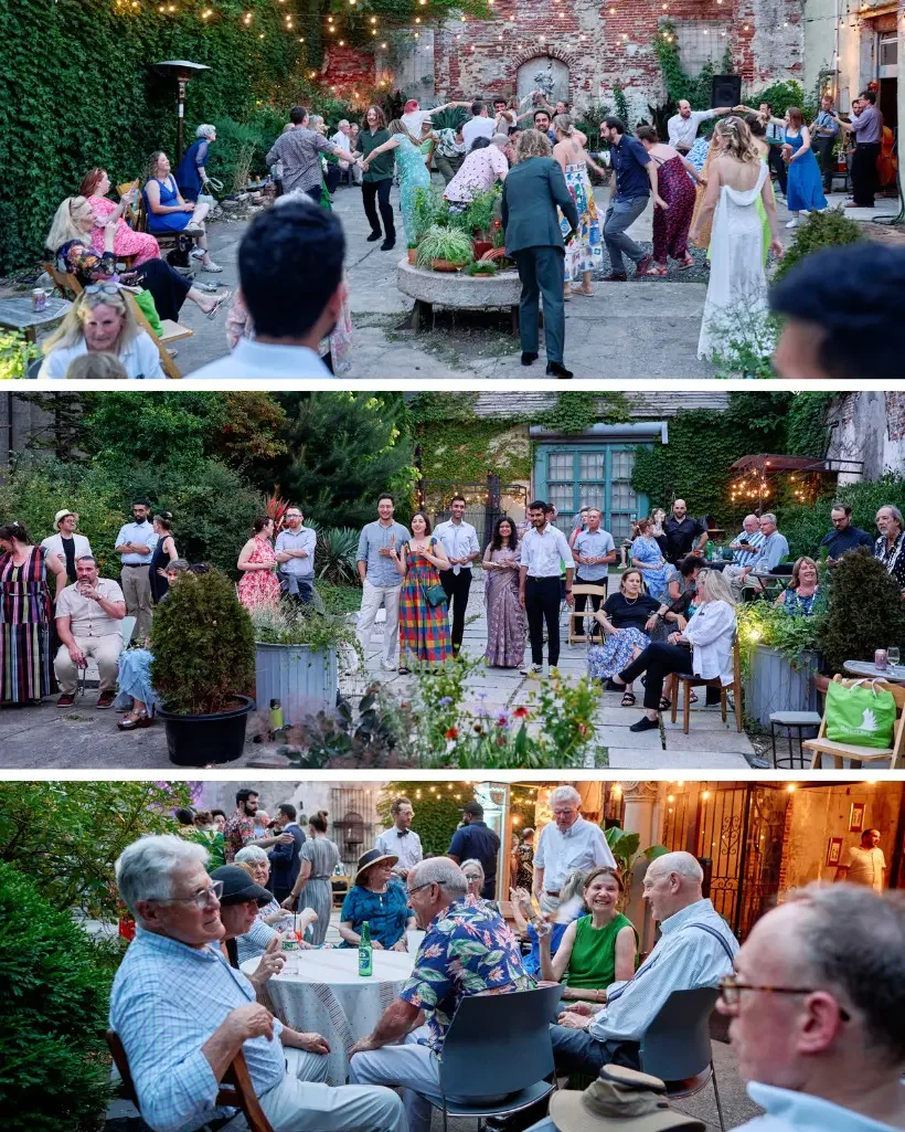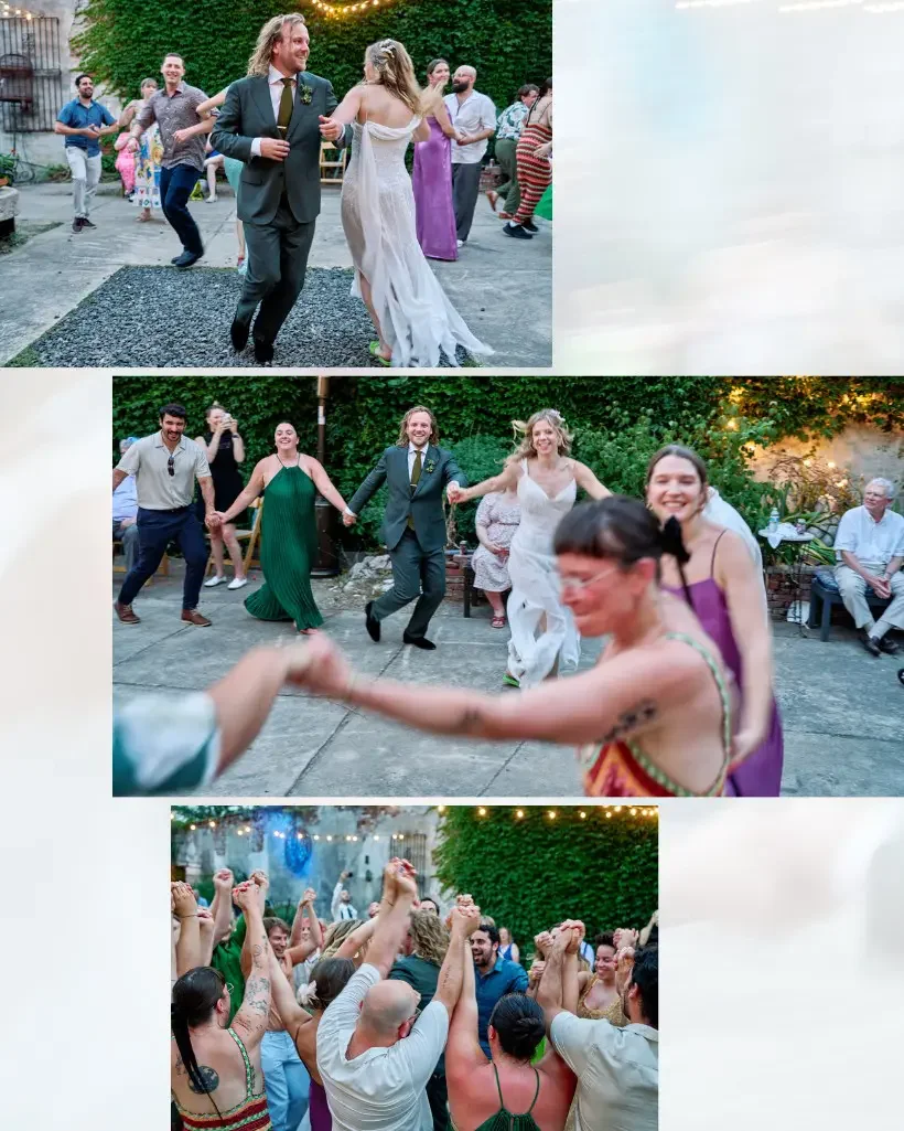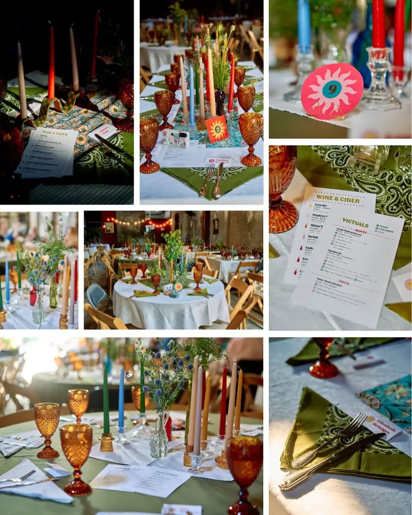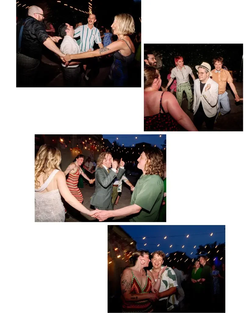 Inside, the reception tables glowed with amber goblets and tall taper candles around wildflower buds, perfect with everyone’s vibrant outfits. Dancing spilled back outside with a fast, folk style, led by West Philly Squares band and loosened into free form, late night moves under the string lights. Somewhere in the mix, a very good service dog made a crowd pleasing cameo. Looking back brings a lot of joy experiencing this heartwarming day.